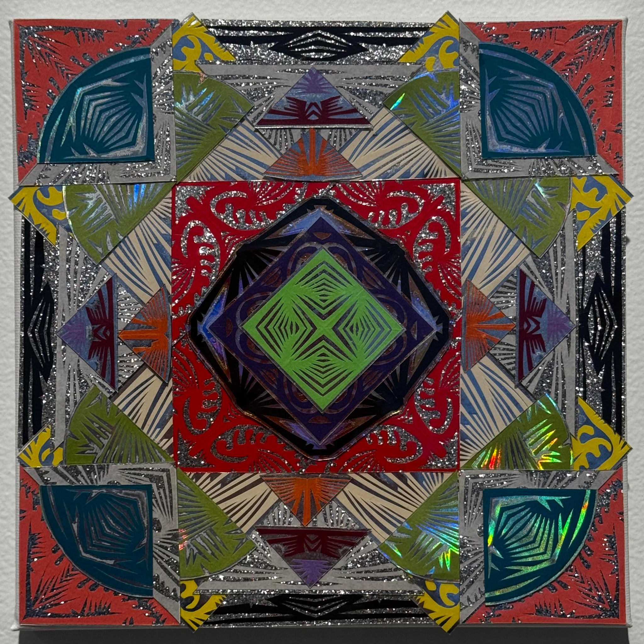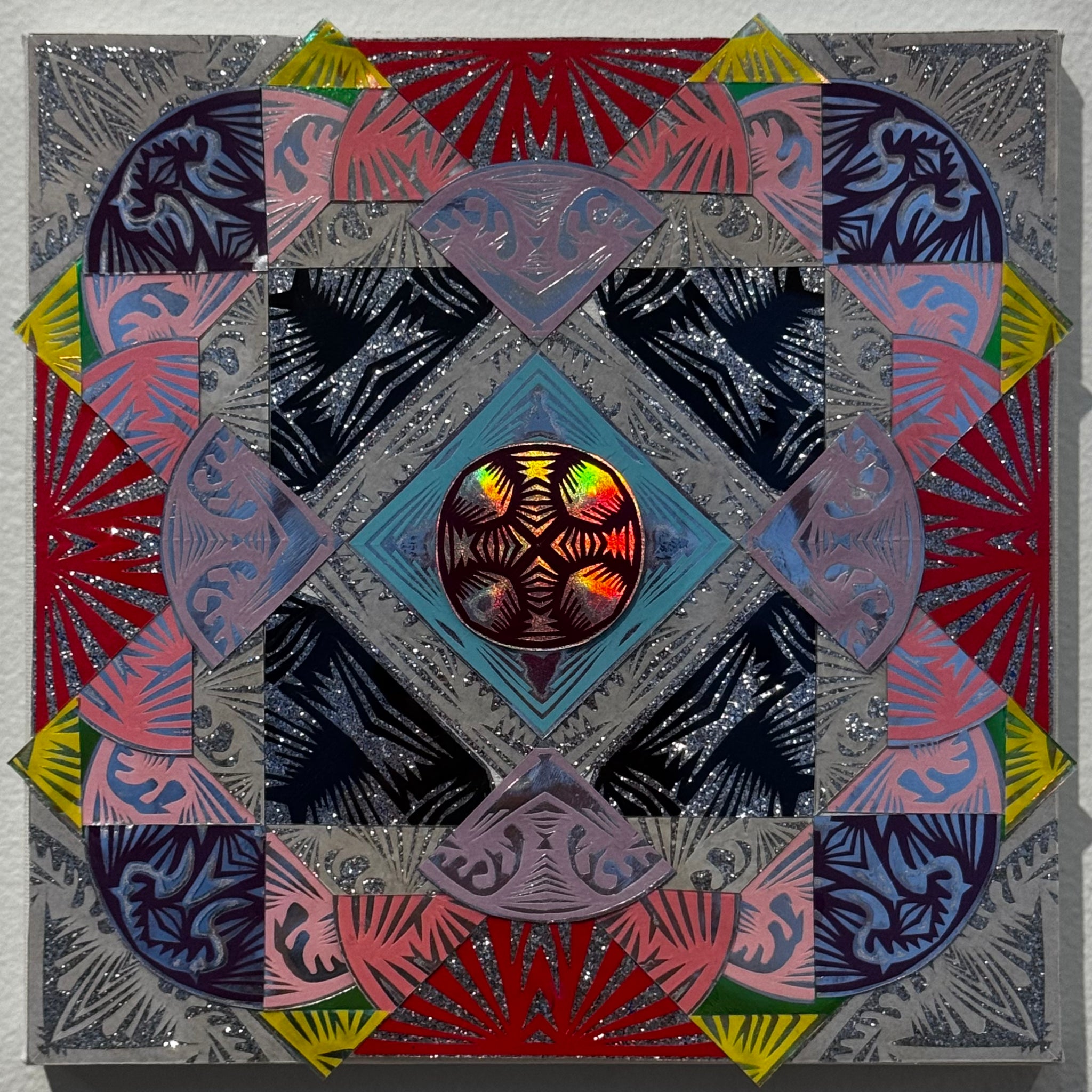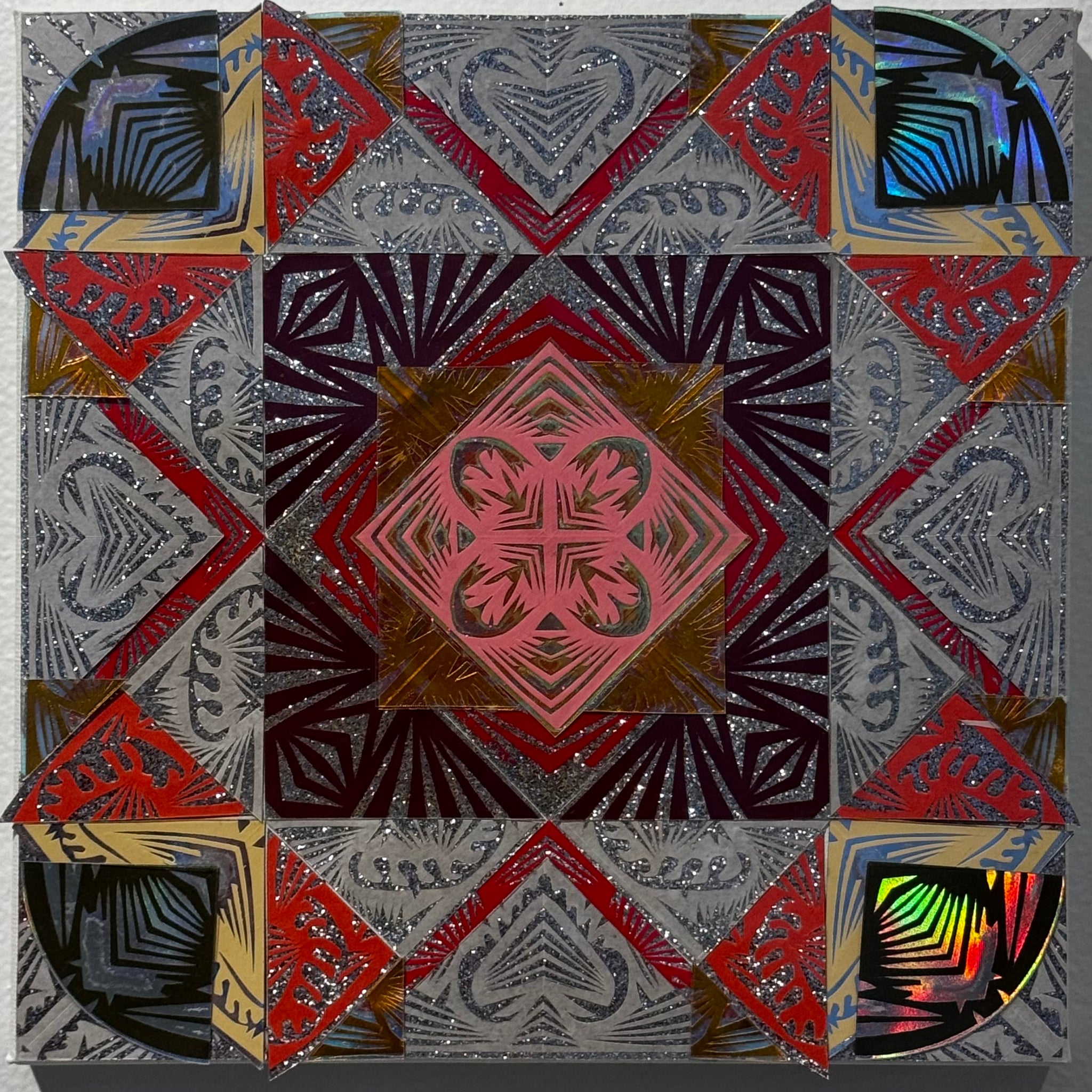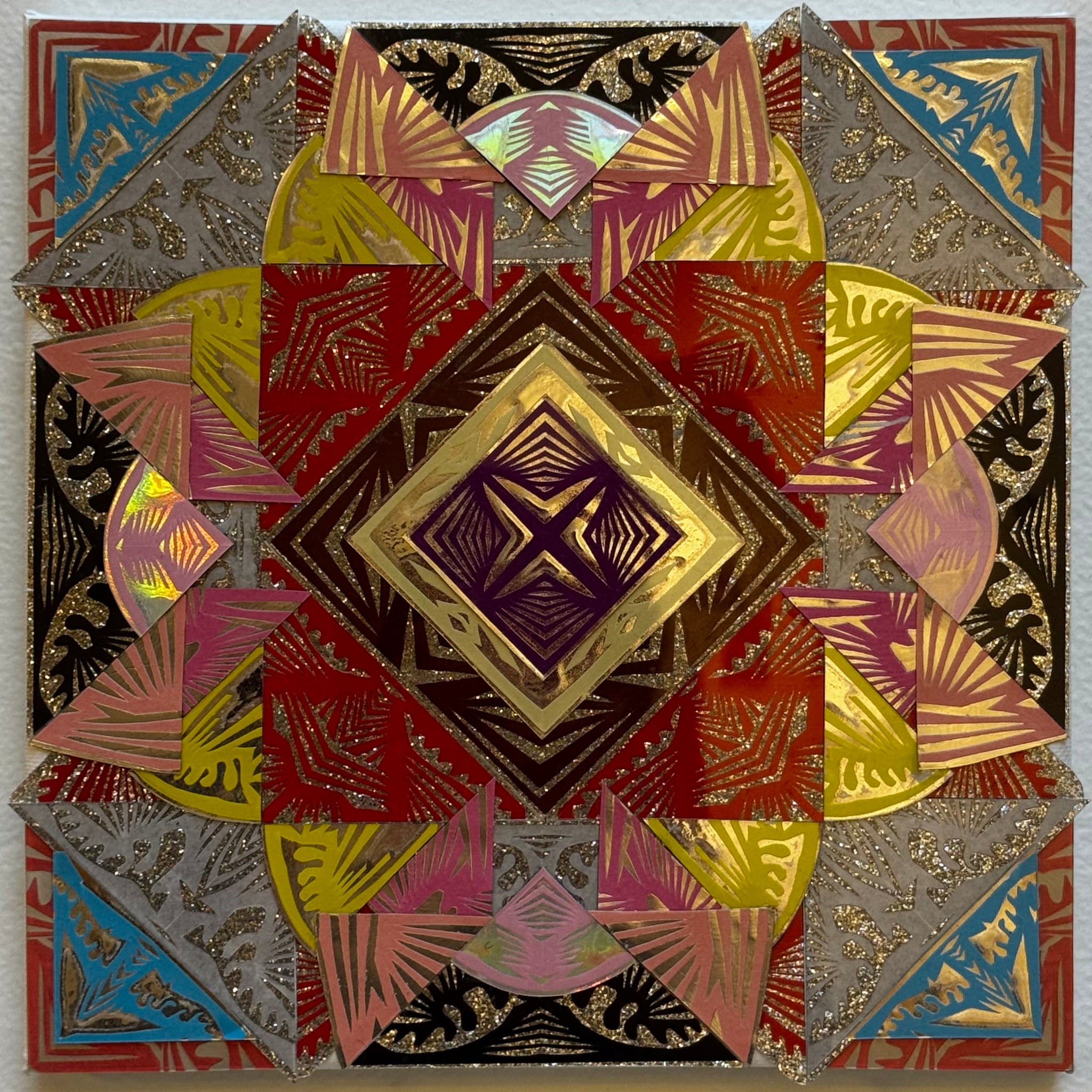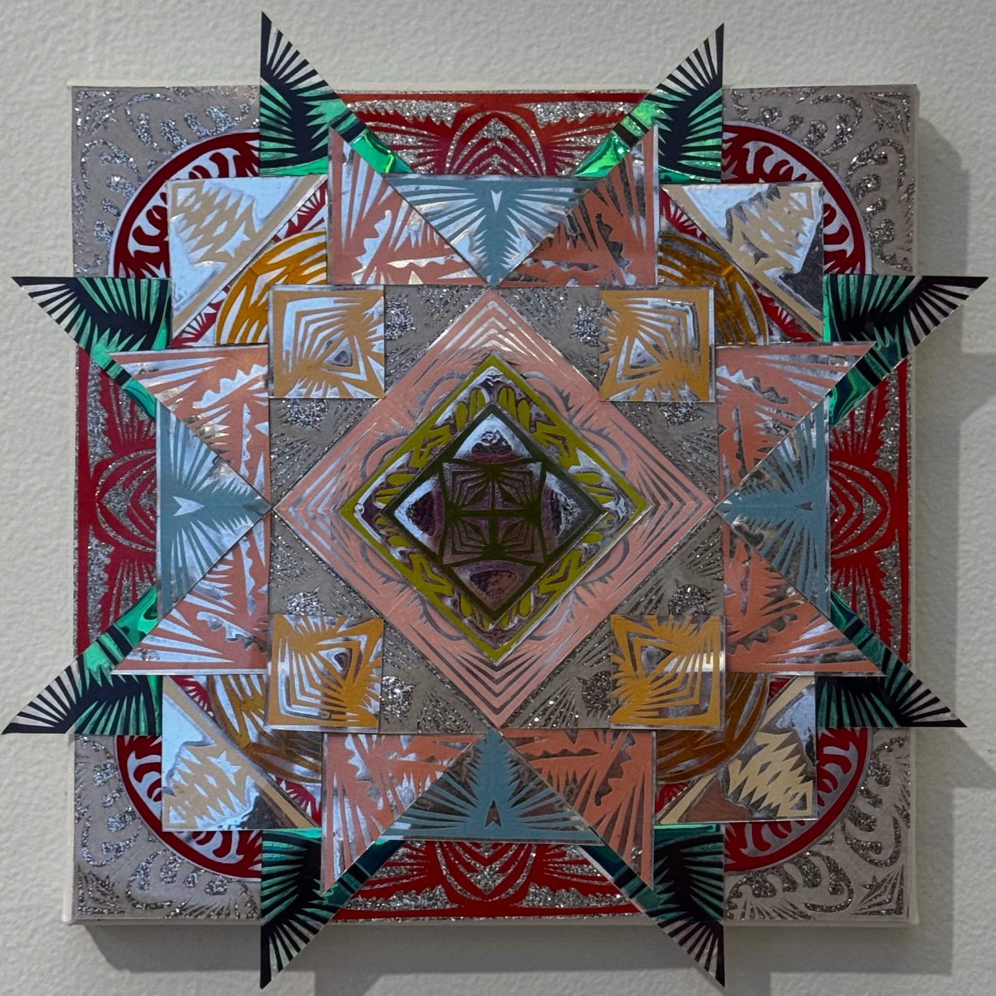 Hand-cut layers of origami paper, iridescent vinyl, and glitter collage on canvas. Each piece is repurposed from a previous public art installations inside The Flatiron Building.