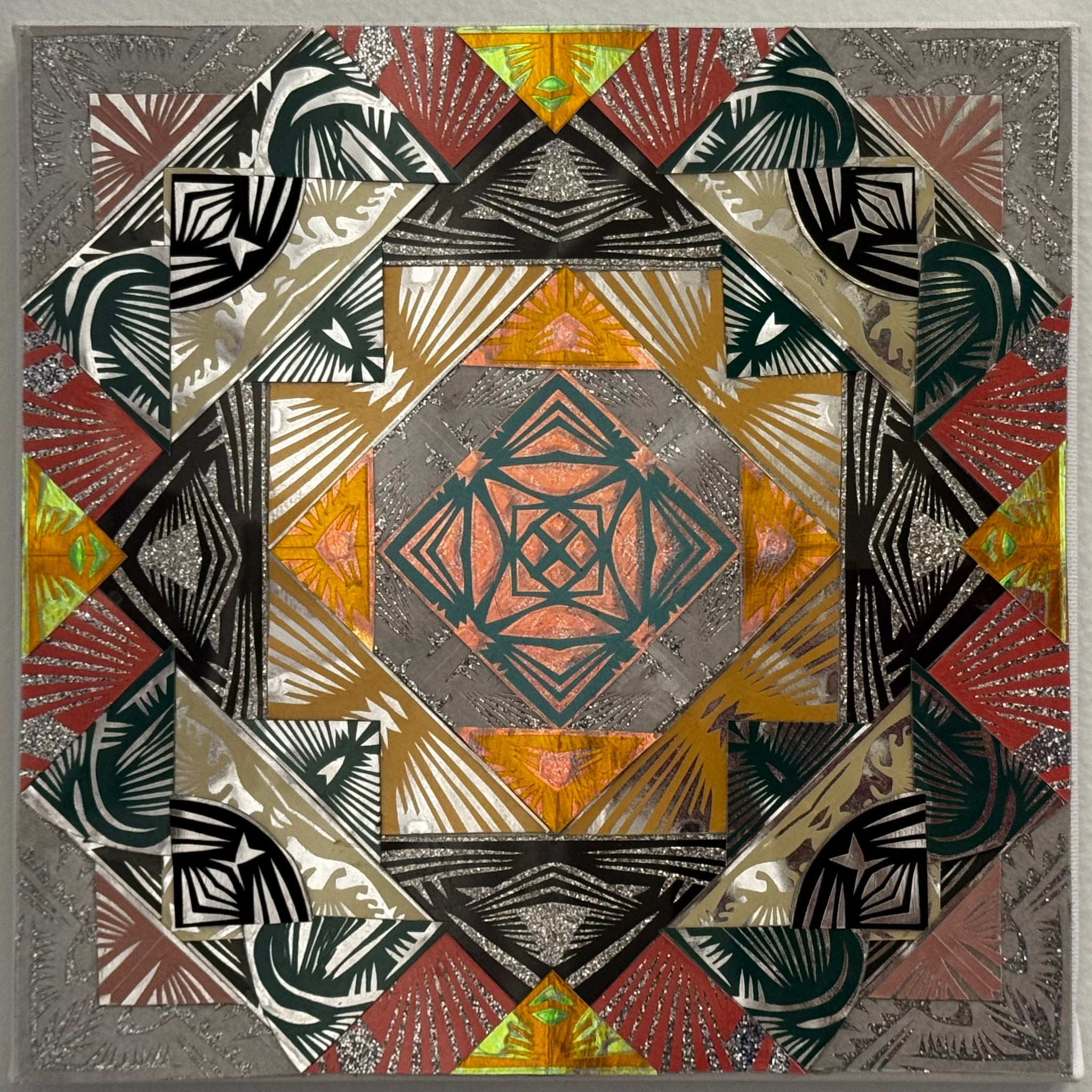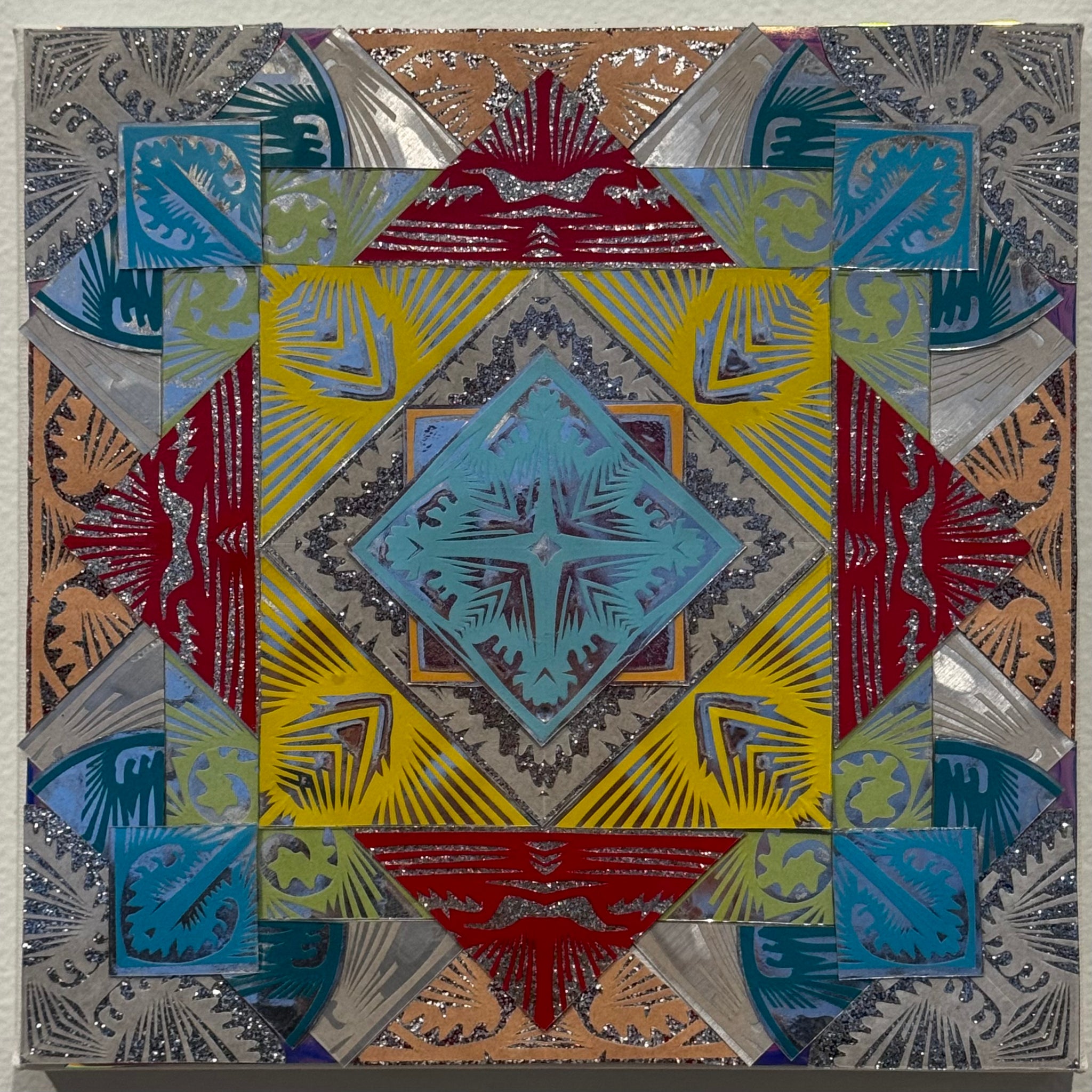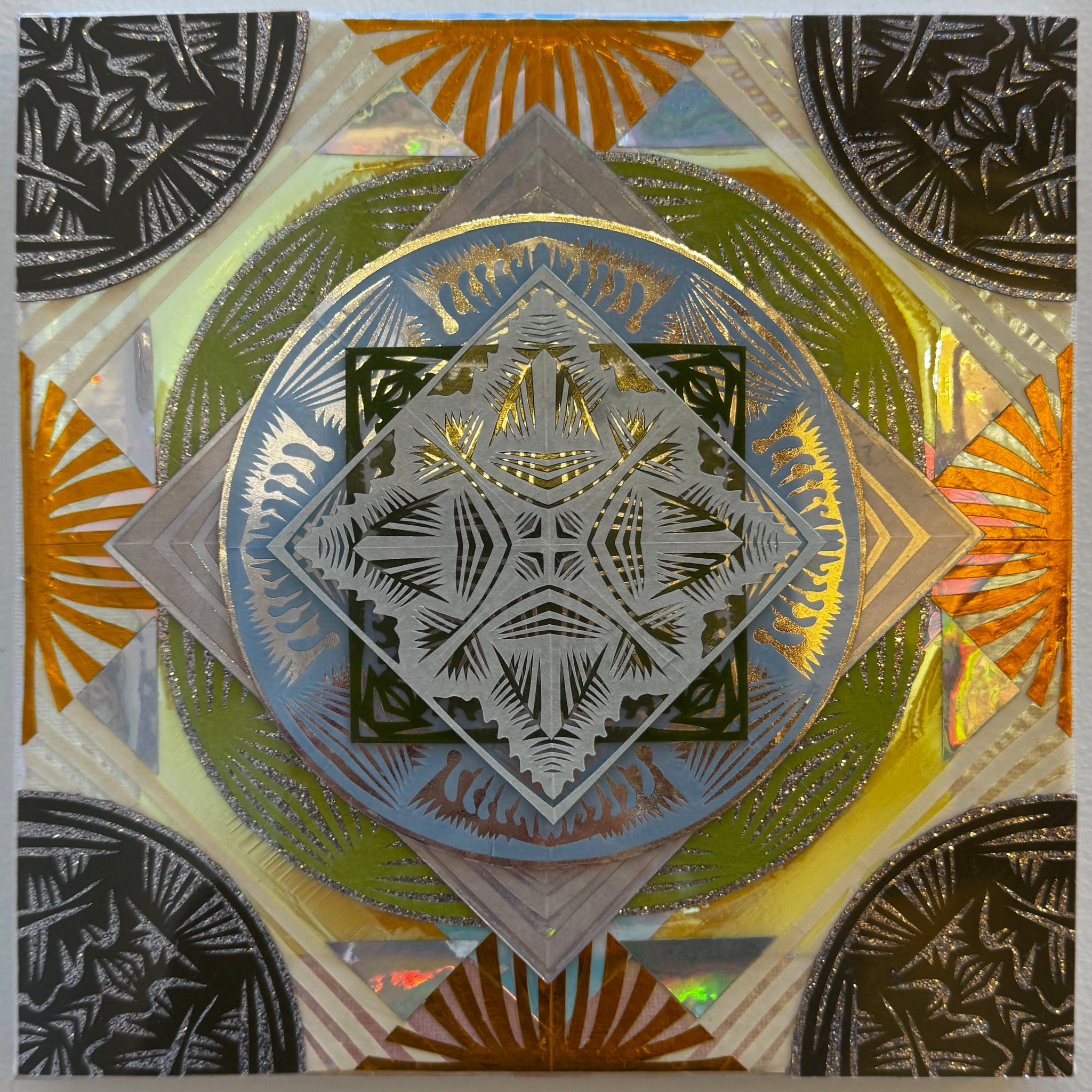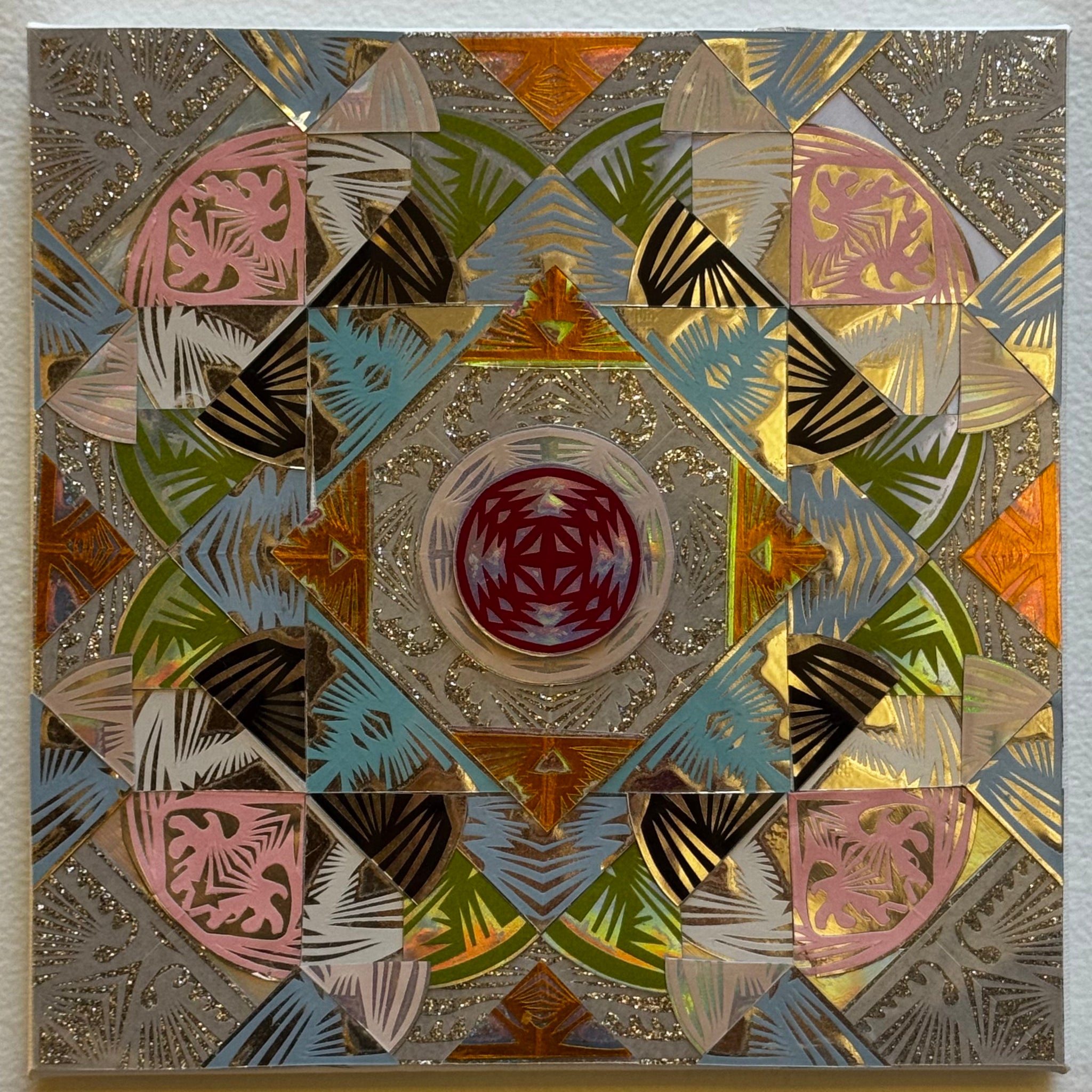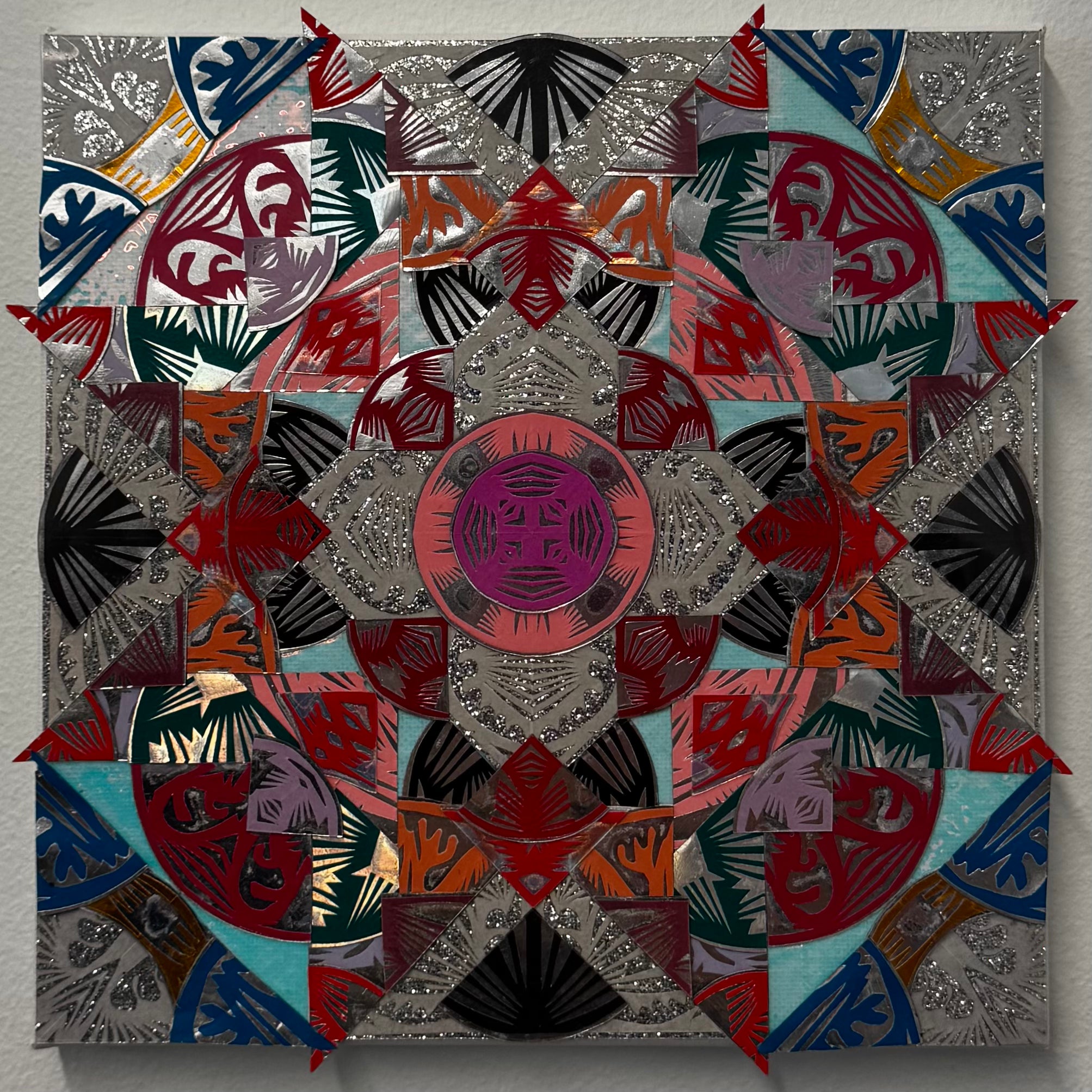 Hand-cut layers of origami paper, iridescent vinyl, and glitter collage on canvas. Each piece is repurposed from a previous public art installations inside The Flatiron Building.
