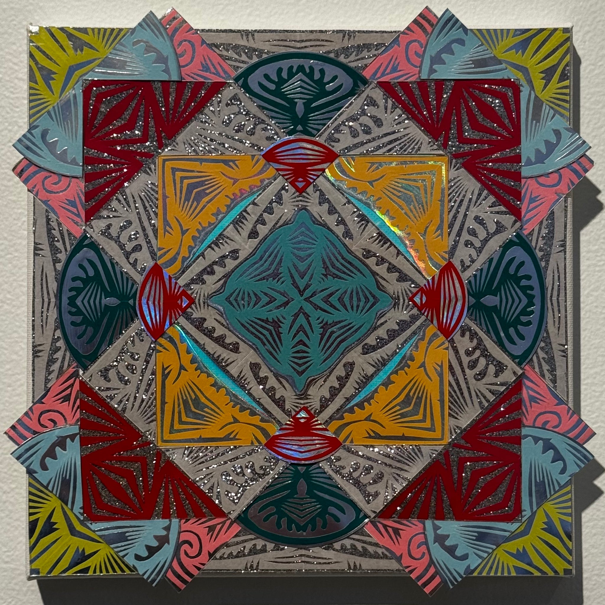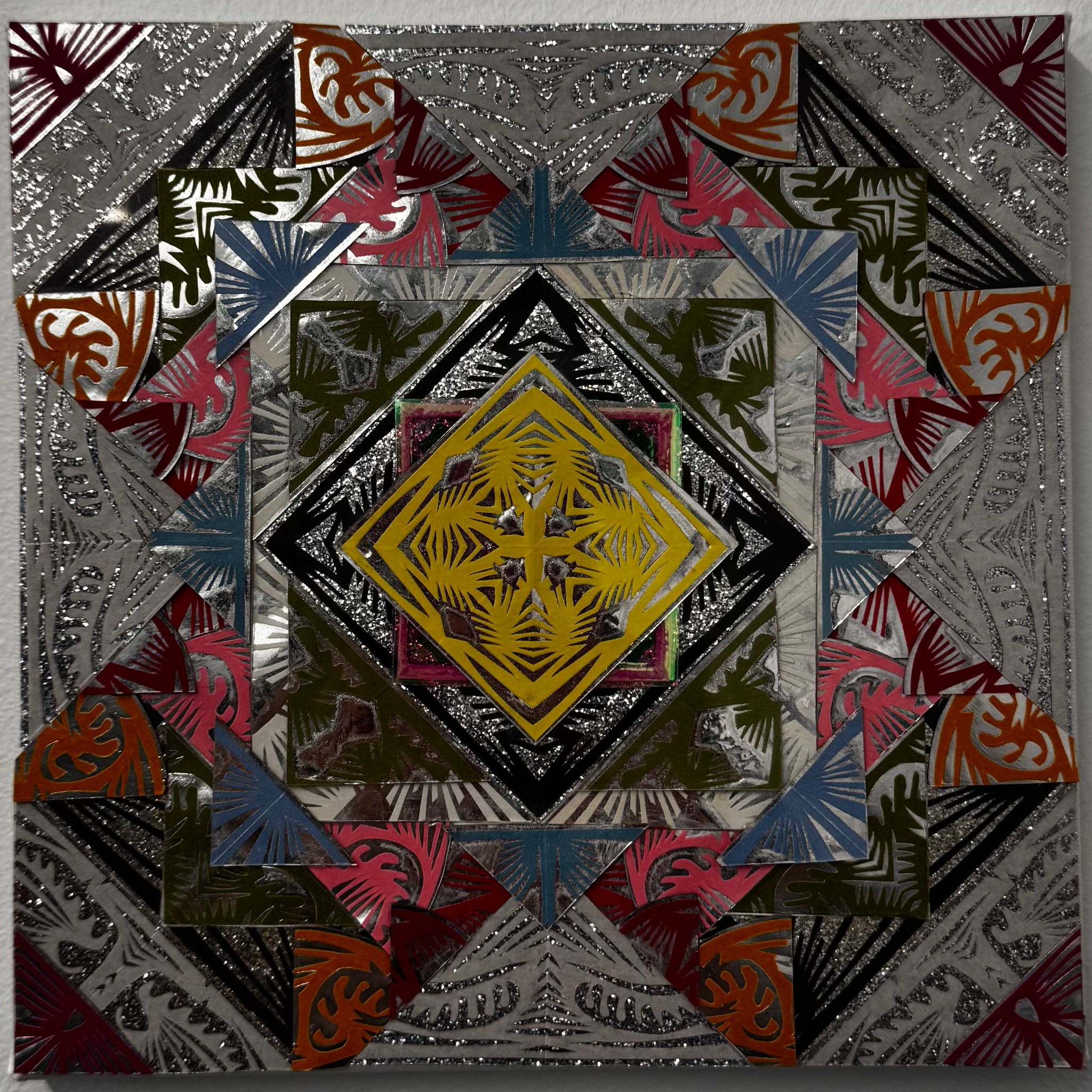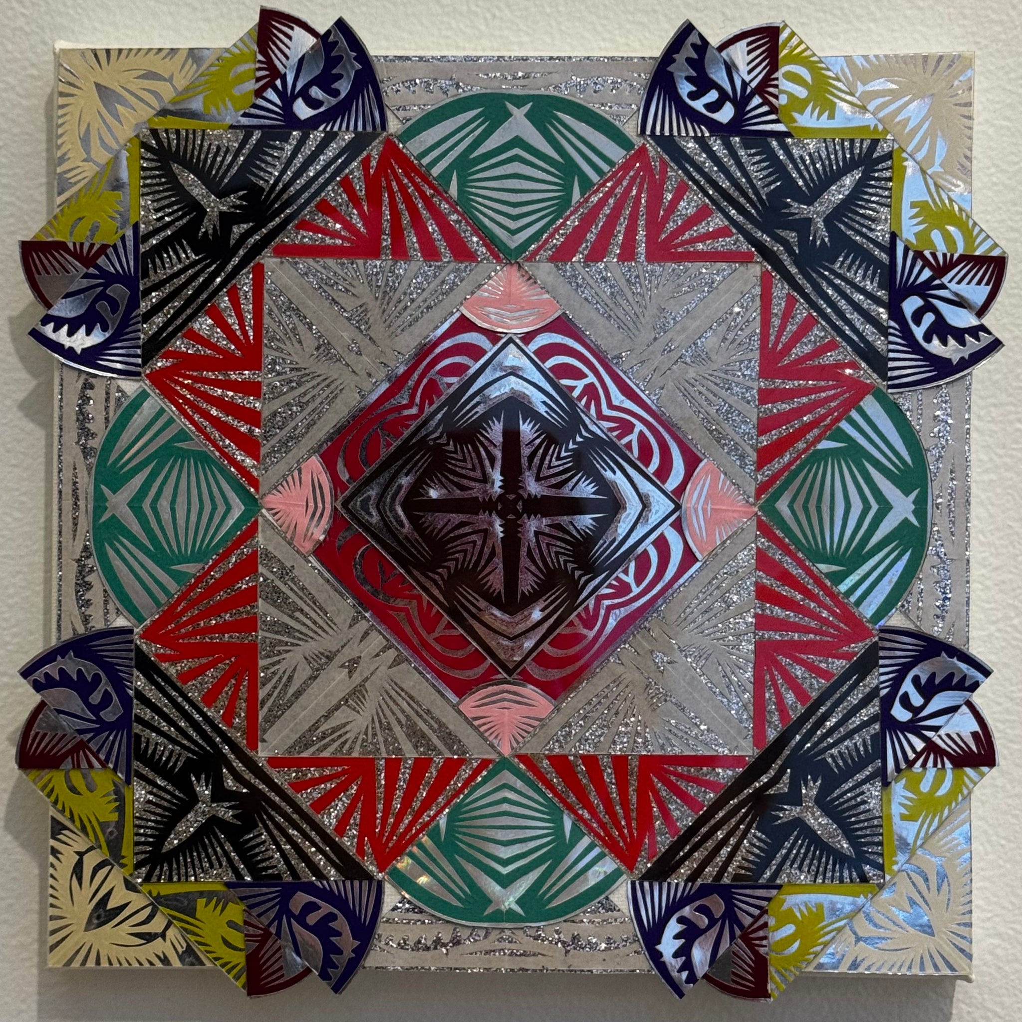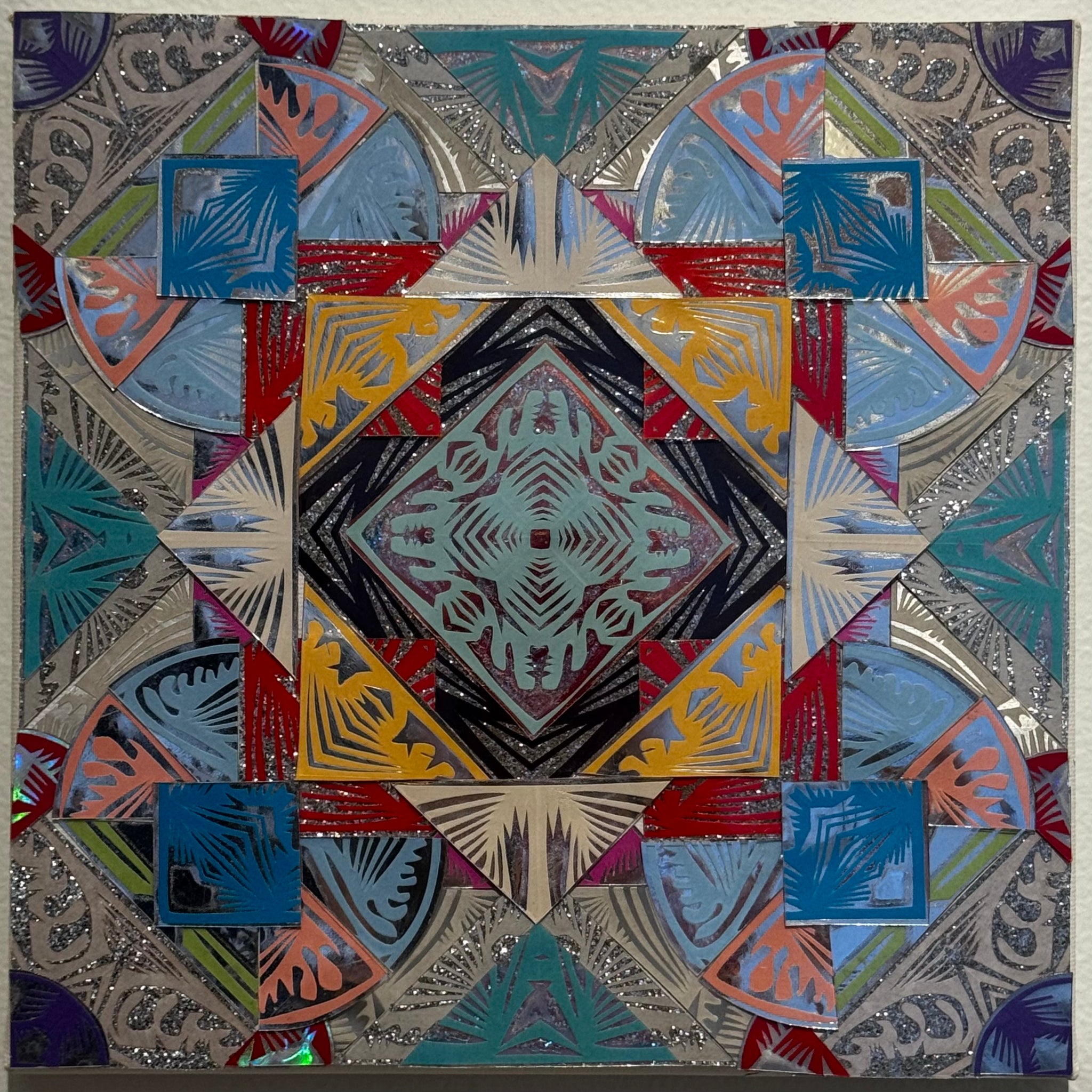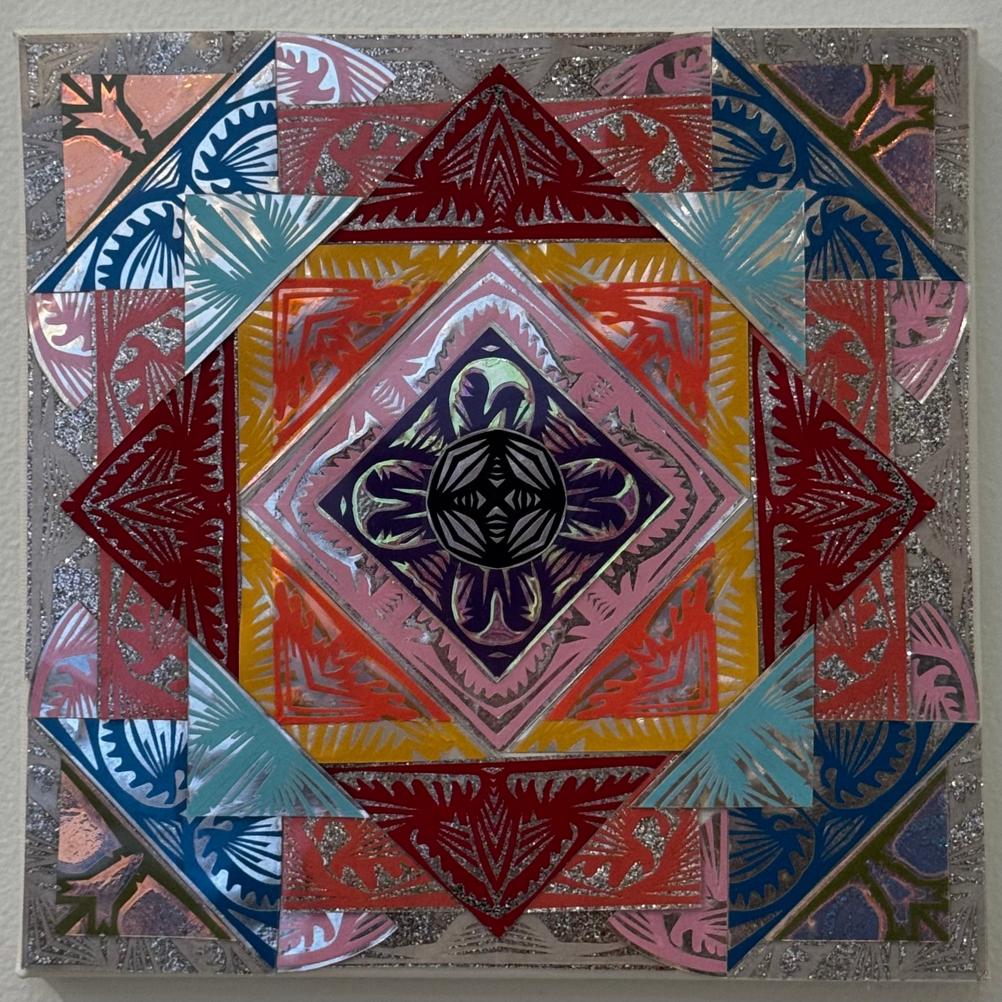 Hand-cut layers of origami paper, iridescent vinyl, and glitter collage on canvas. Each piece is repurposed from a previous public art installations inside The Flatiron Building.