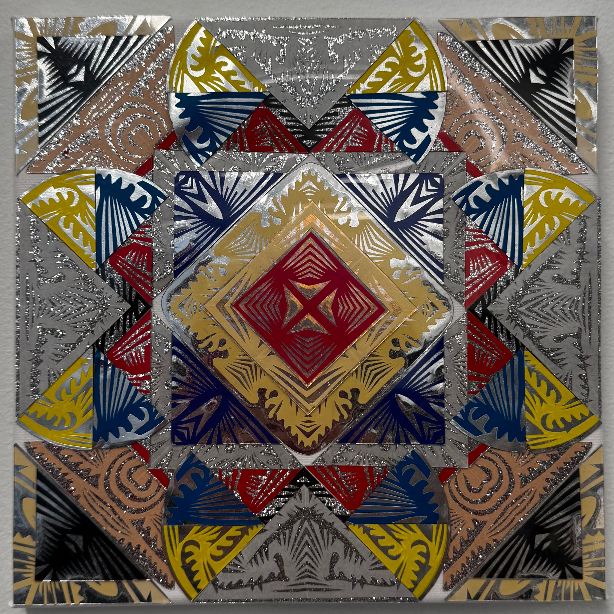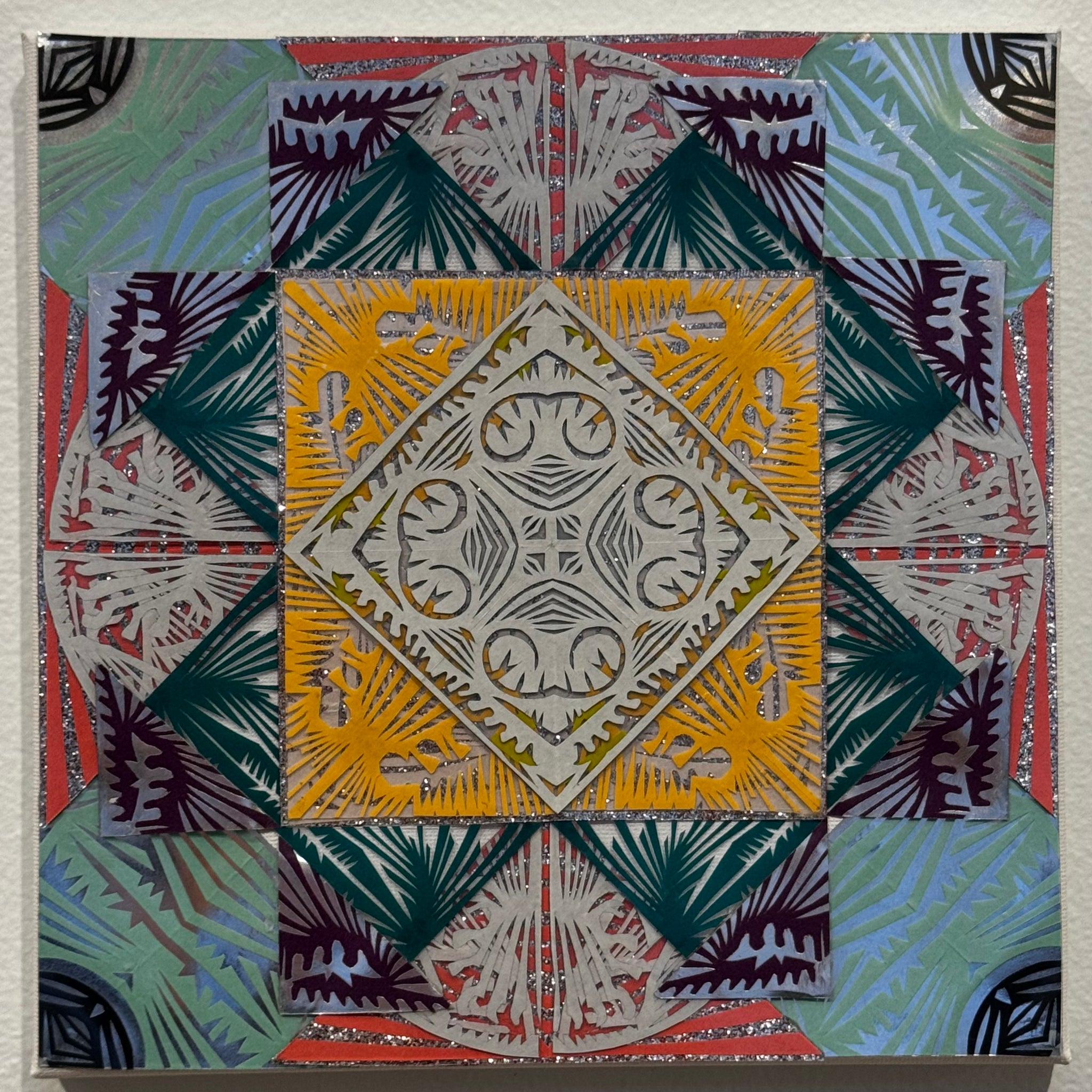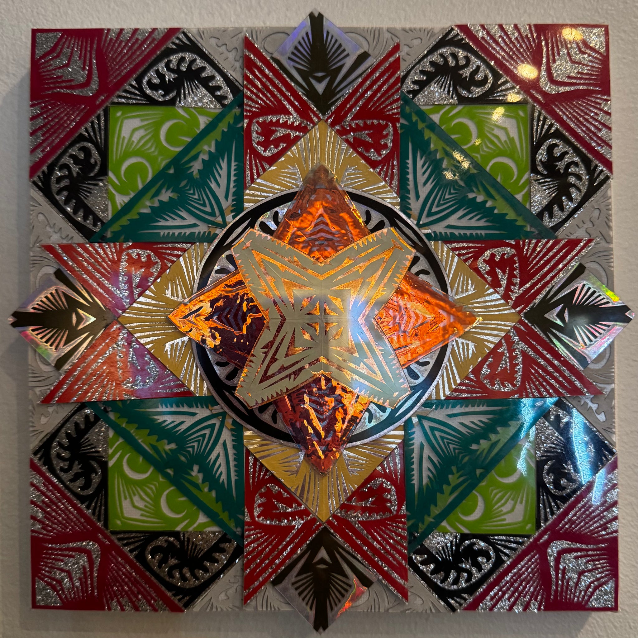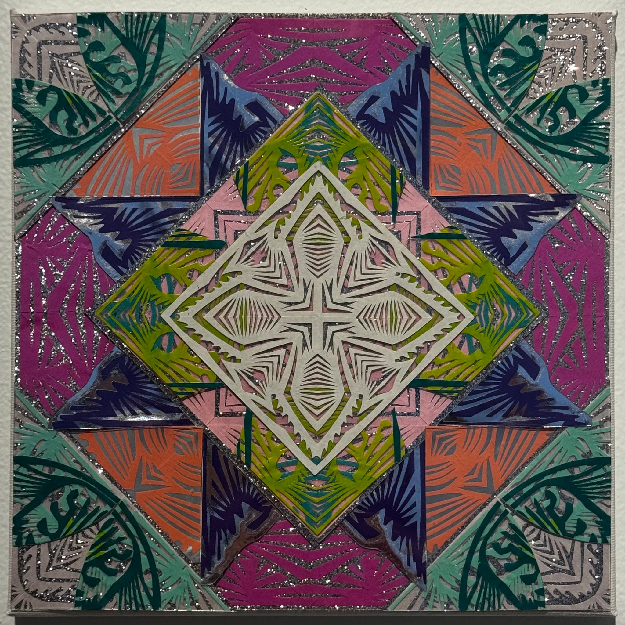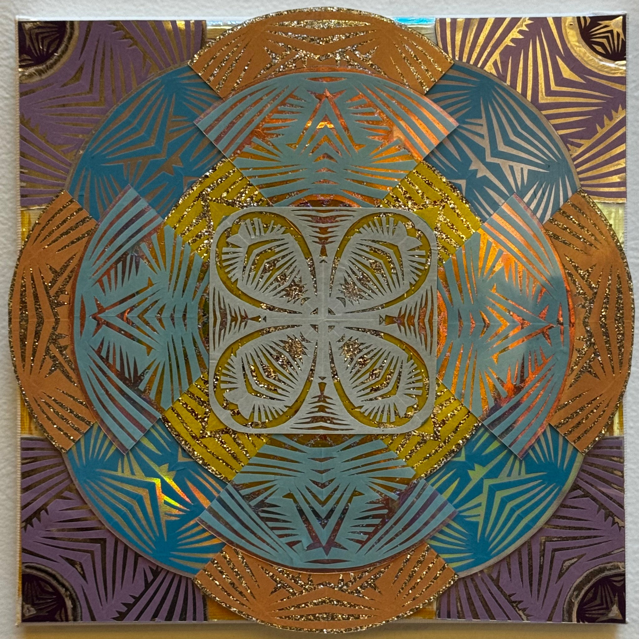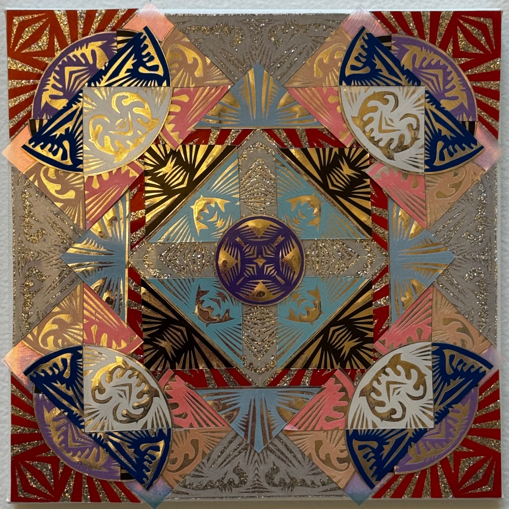 Hand-cut layers of origami paper, iridescent vinyl, and glitter collage on canvas. Each piece is repurposed from a previous public art installations inside The Flatiron Building.