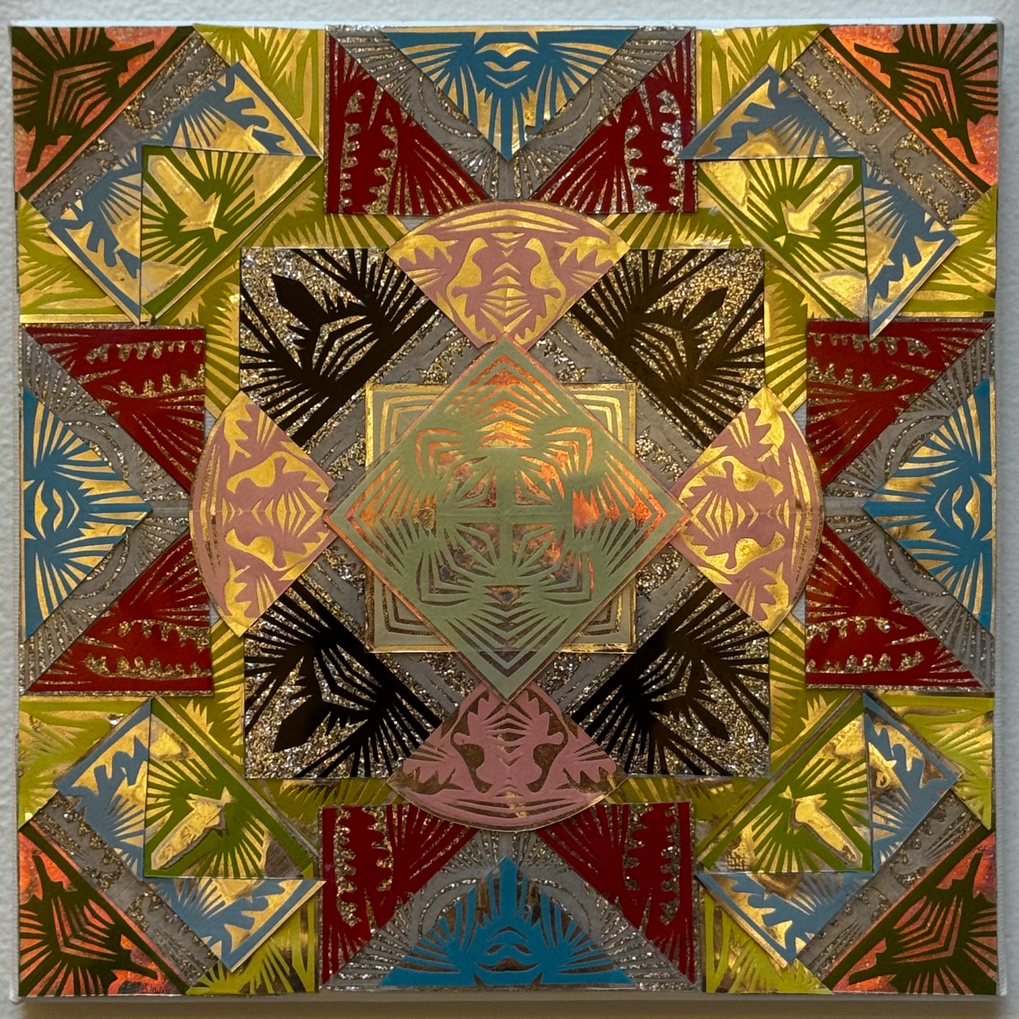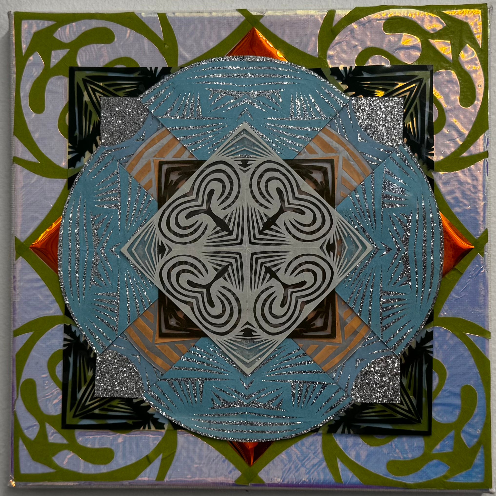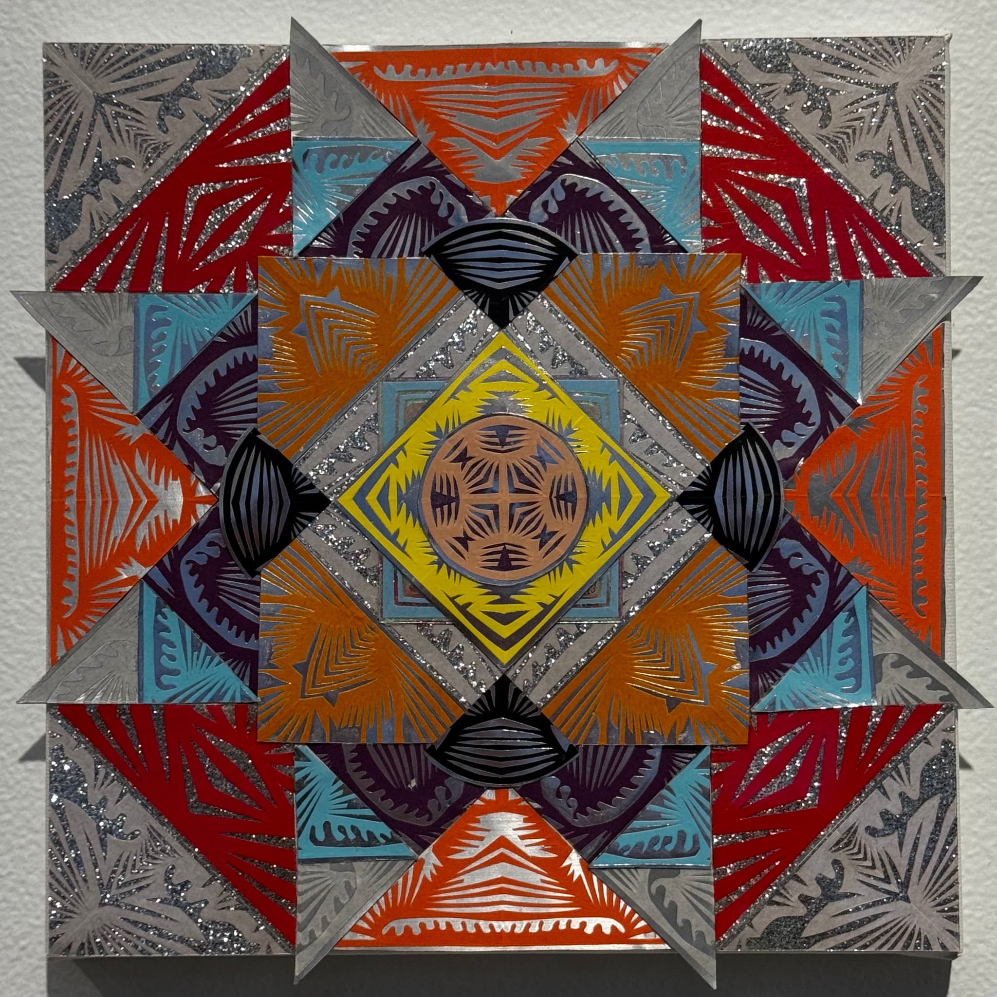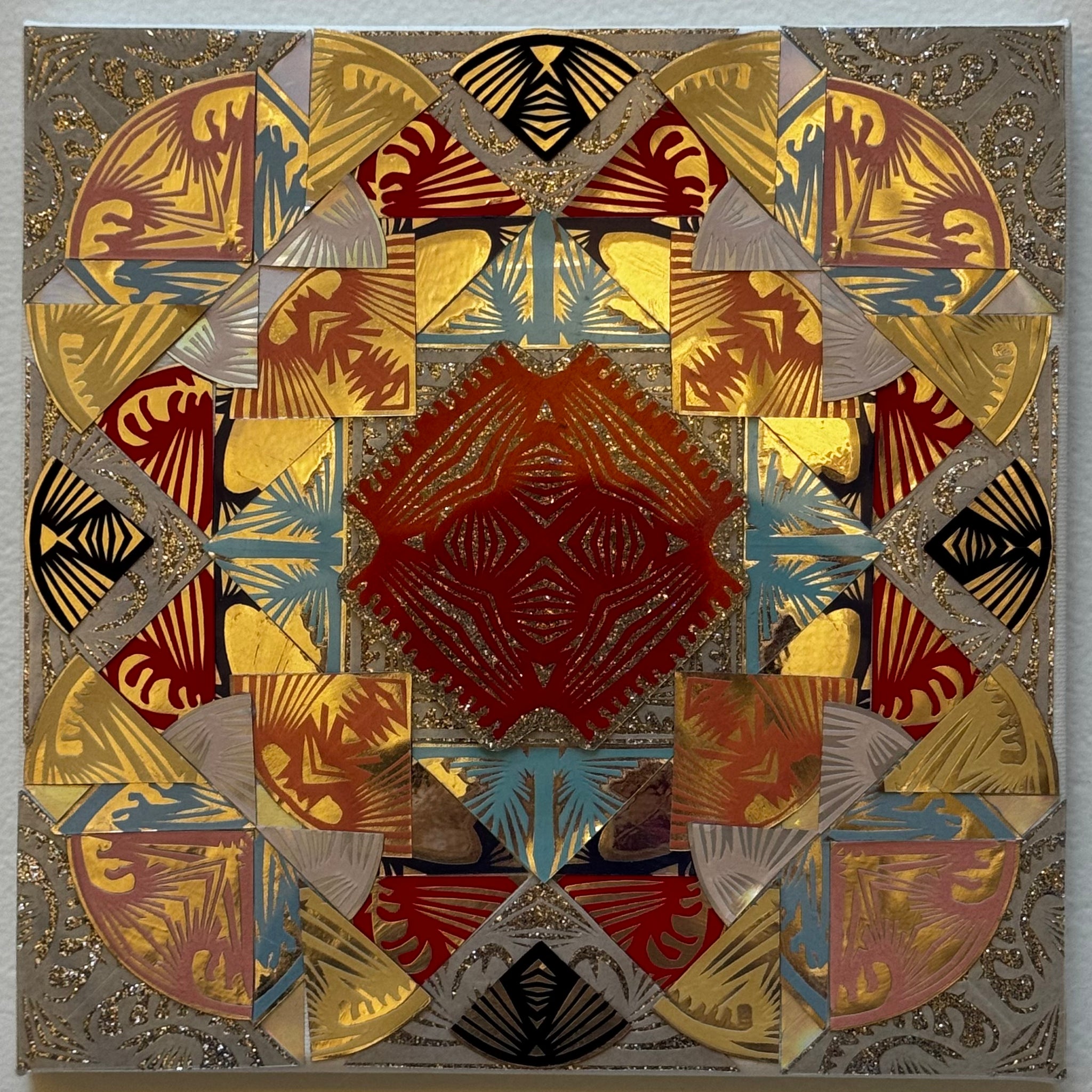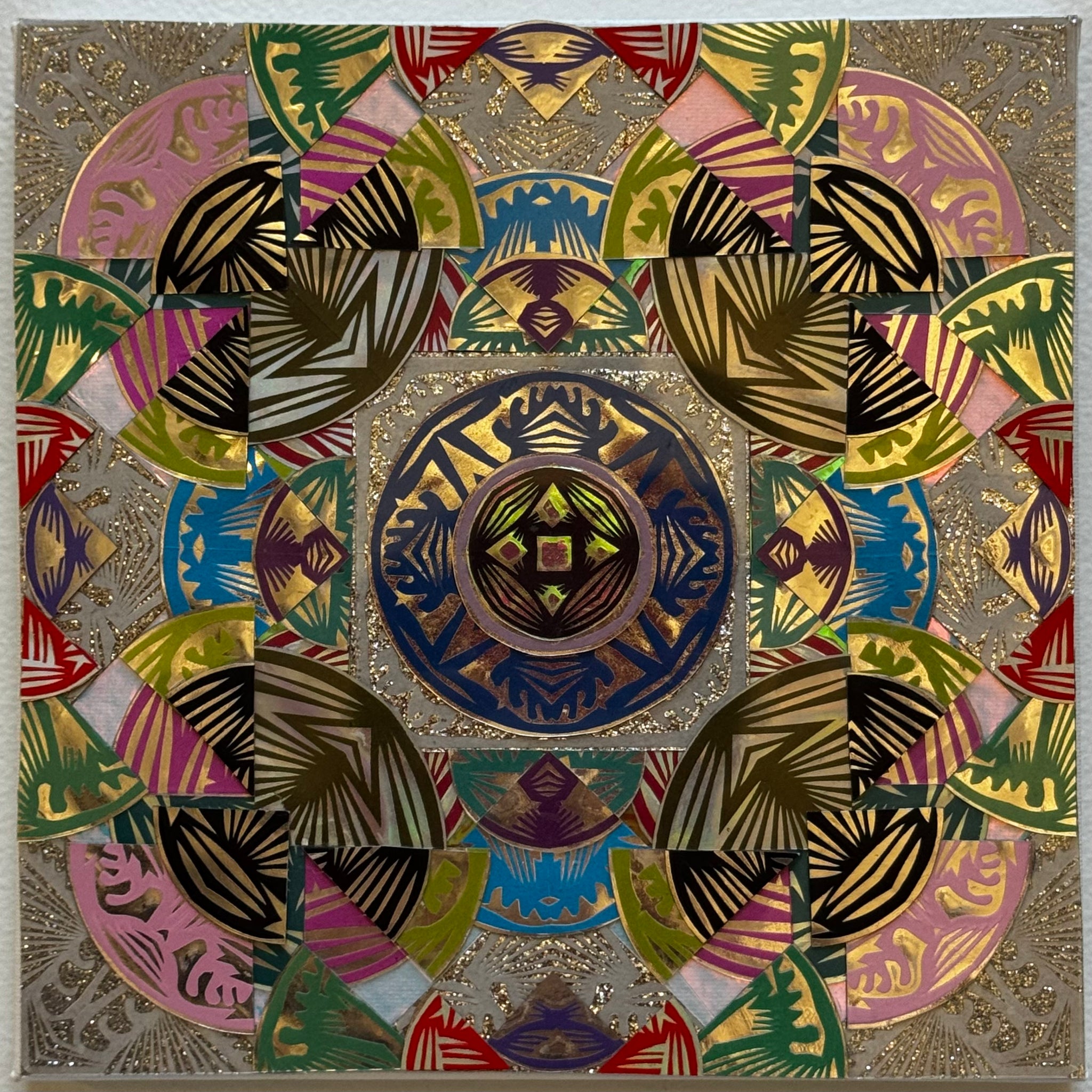 Hand-cut layers of origami paper, iridescent vinyl, and glitter collage on canvas. Each piece is repurposed from a previous public art installations inside The Flatiron Building.
