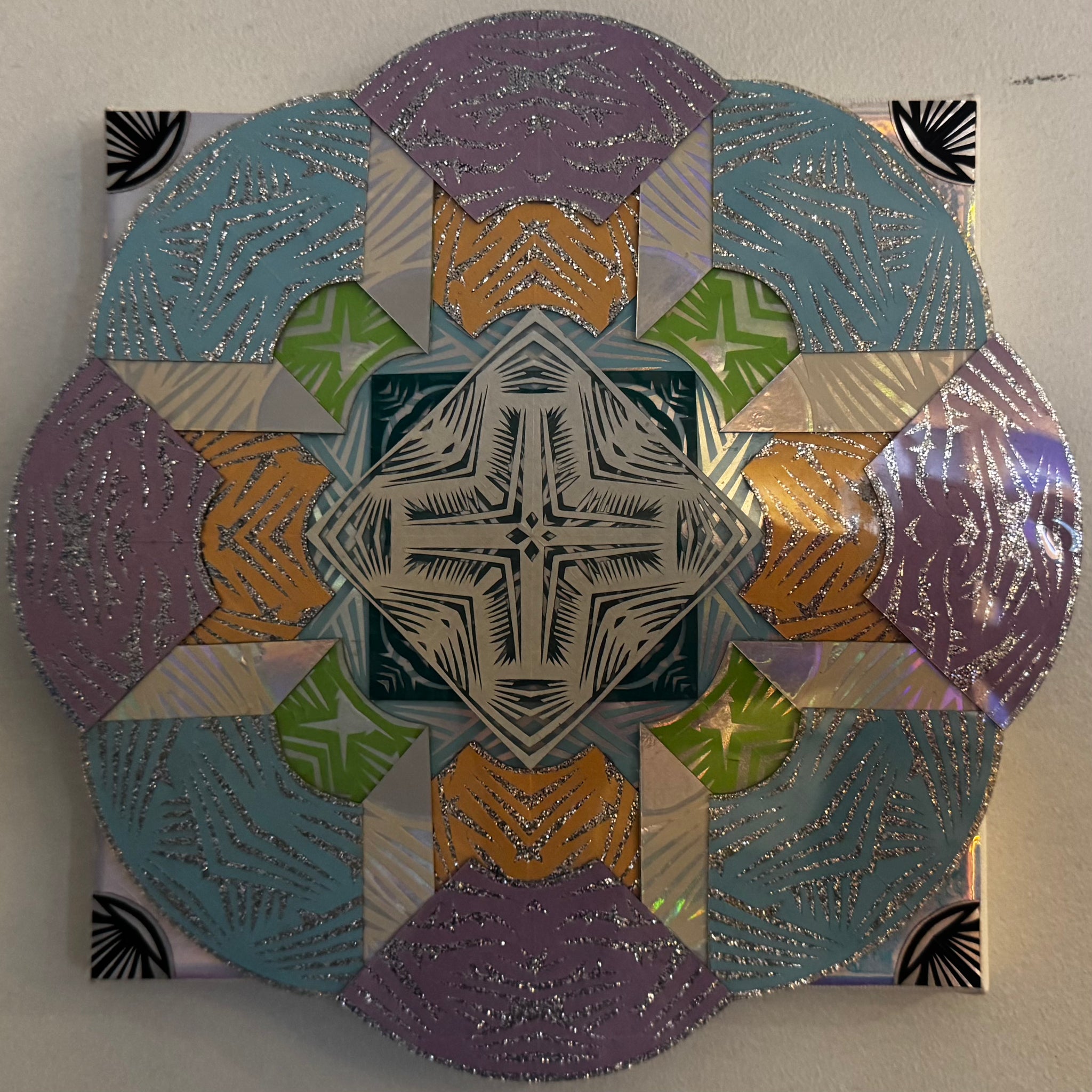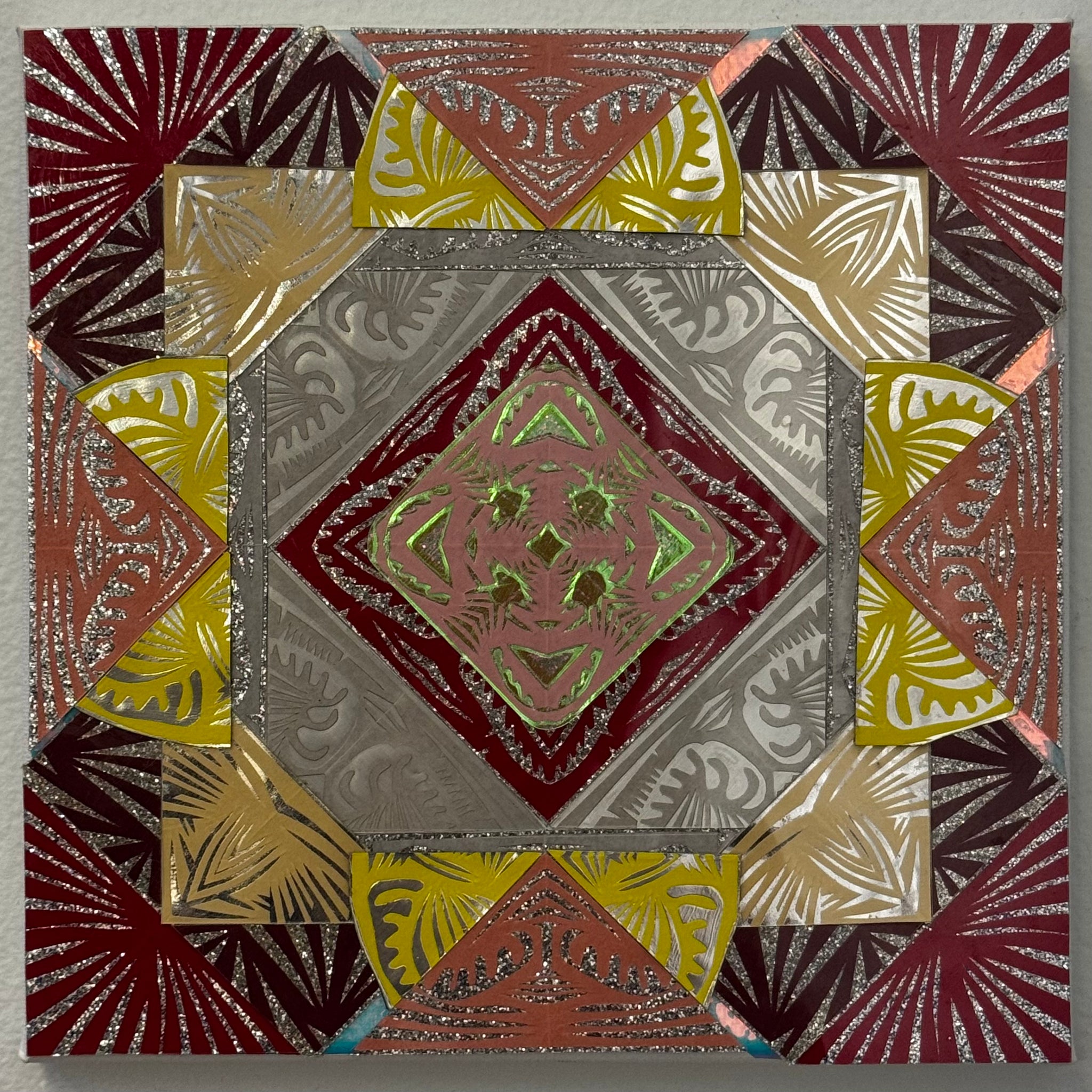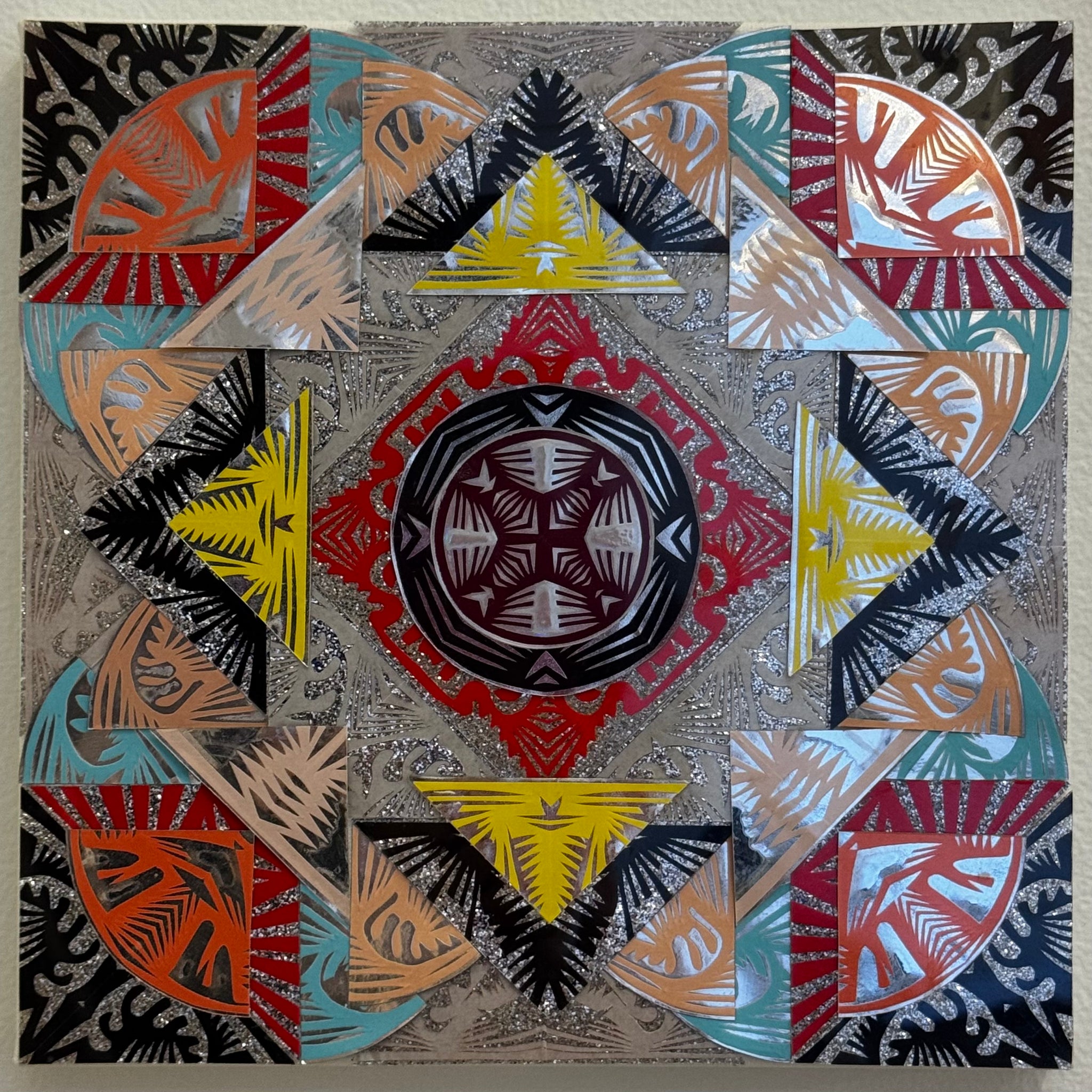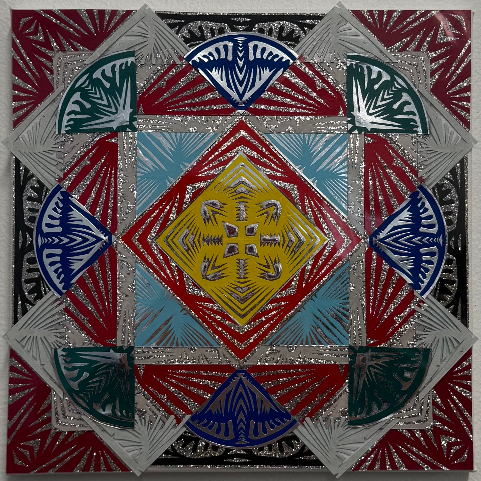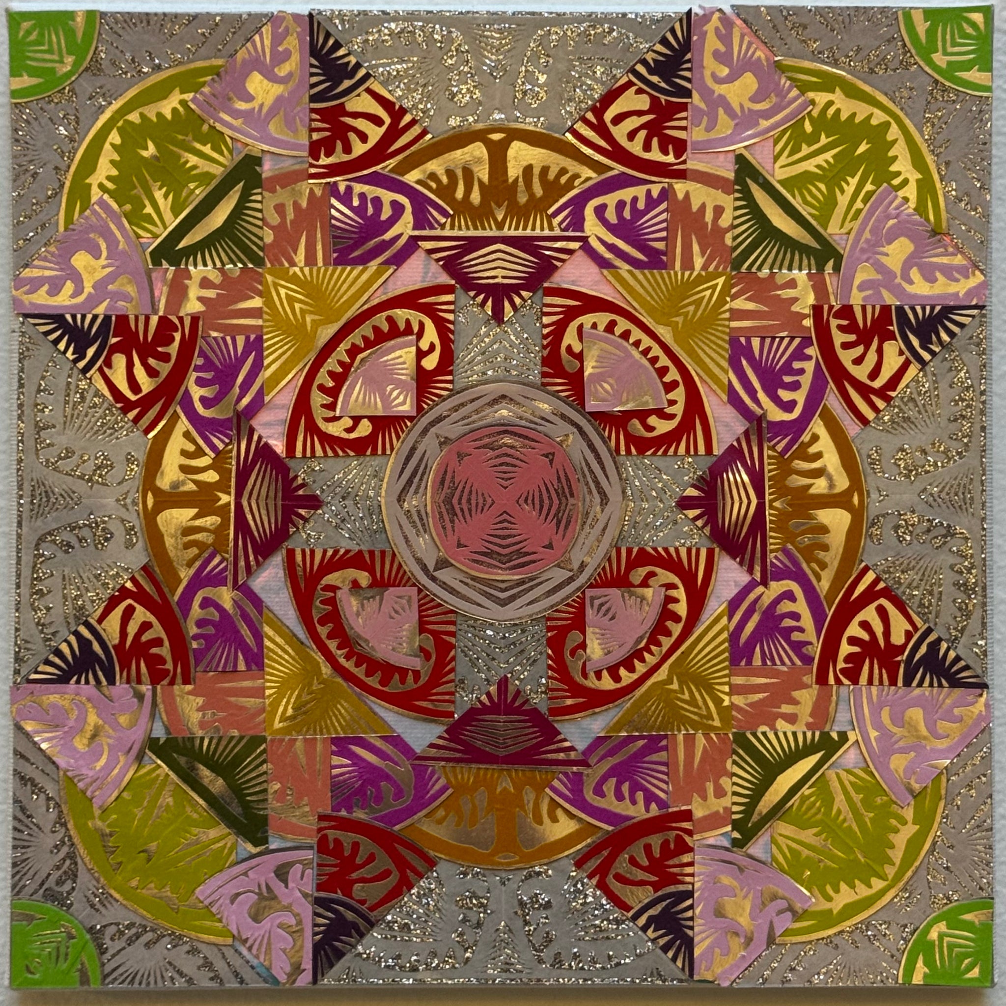 Hand-cut layers of origami paper, iridescent vinyl, and glitter collage on canvas. Each piece is repurposed from a previous public art installations inside The Flatiron Building.